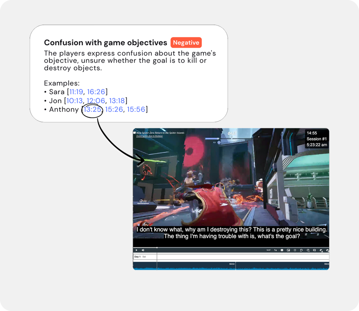 Watch real players play your game. Video, audio and touch recording lets you review gameplay like you’re in the room, while transcripts and surveys add context to qualitative data. First Findings AI Analysis highlights major themes, linking right to the supporting clips for evidence and saving you hours watching playbacks.